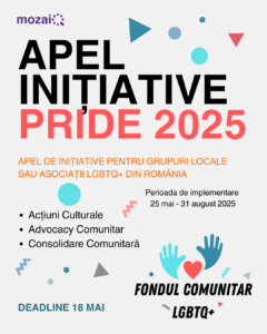 Pentru a îmbunătăți experiența dumneavoastră de utilizare a acestui site, Asociația MozaiQ LGBT folosește fișiere de tip cookie. De asemenea, respectăm regulamentul GDPR în vigoare. Mai multe detalii