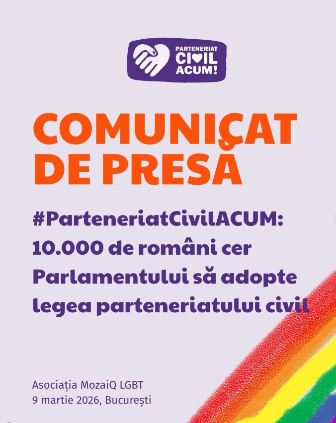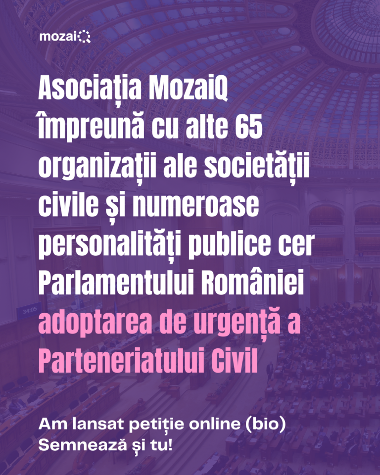Asociația MozaiQ, împreună cu alte 65 organizații ale societății civile și zeci de personalități publice și aliați solicită Parlamentului României adoptarea de urgență a propunerii legislative Pl-x 152/2019 sau Pl-x 153/2019 referitor la parteneriatul civil, care oferă un cadru de recunoaștere legală pentru toate cuplurile necăsătorite din România.